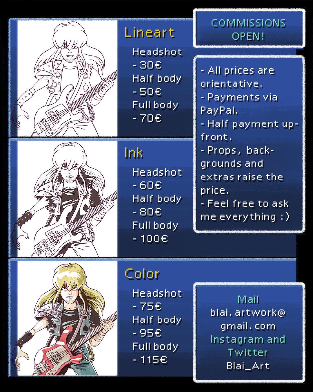 For personal comissions check my comission chart. For professional inquiries, please contact me via email or other social media (links uphead).